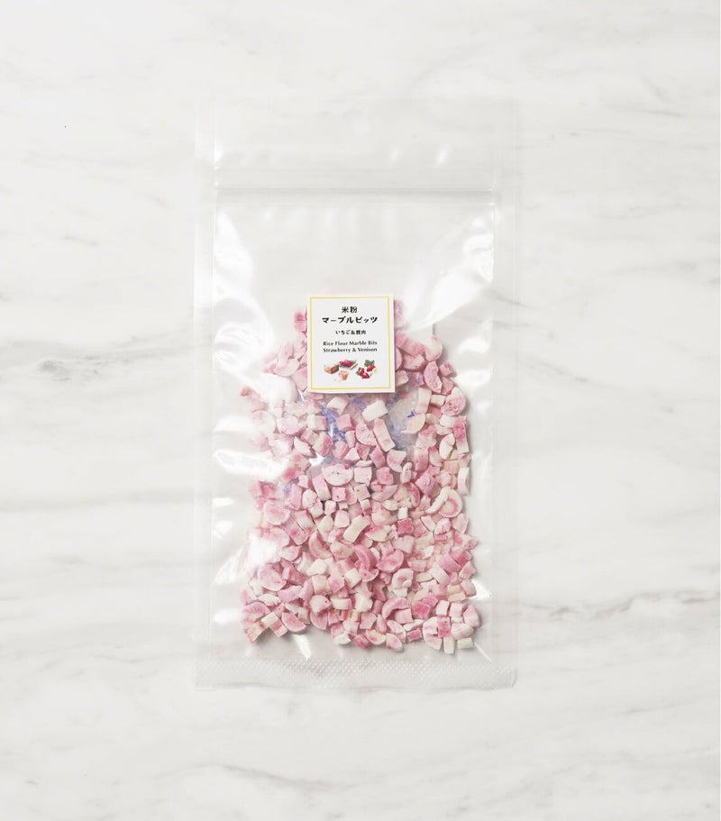 小麦粉・卵・砂糖不使用のグルテンフリー米粉ビッツ。 嗜好性の良い国産の鹿肉パウダーと苺を混ぜ込み、見た目もかわいいマーブル柄に焼き上げました。甘酸っぱい苺と優しい蜂蜜の甘さがわんちゃんを虜にします。カリカリした食感に満足度も上がります。さらに低カロリーでダイエットにぴったり。 安心安全な国産・無添加(着色料、保存料、香料不使用)おやつです。お出かけに便利な小袋入りです。
