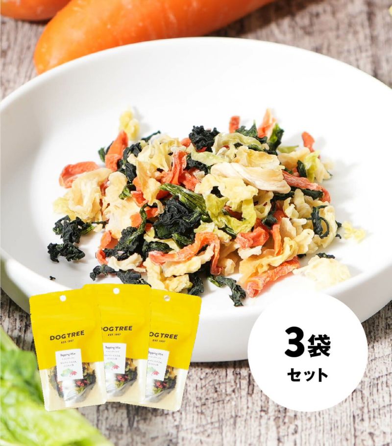 ごはんの時間がもっと楽しくなる、香り・食感・栄養を考えたドッグツリーならではのトッピングシリーズ。 常備していると安心! じっくり乾燥させ旨みと栄養を閉じ込めた、国産のきゃべつ・にんじん・ほうれん草をミックスしました。 胃腸系のトラブルを解消する効果のあるきゃべつ、皮膚や粘膜を健康に保つ働きのあるβーカロテンが豊富なにんじん、一緒に食べた物の脂肪の吸収を妨げる作用のあるほうれん草を使用した国産・無添加のトッピングです。 お湯で約3~5分戻すか、乾燥野菜がつかる程度の水を入れてレンジでチンしていただき、野菜を柔らかくもどしてから使ってください。 ダイエット中のかさましにもおすすめです。