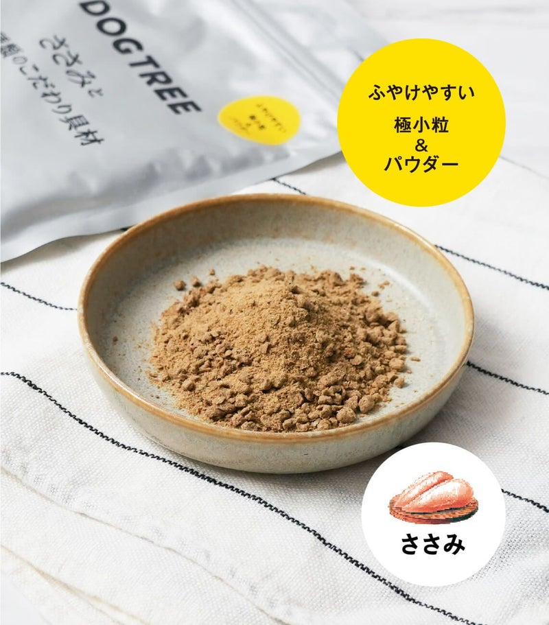 硬いものが苦手な子やふやかしたフードが好きな子向けに、栄養成分はそのまま、ふやけやすい極小粒とパウダー状のフードをご用意しました。