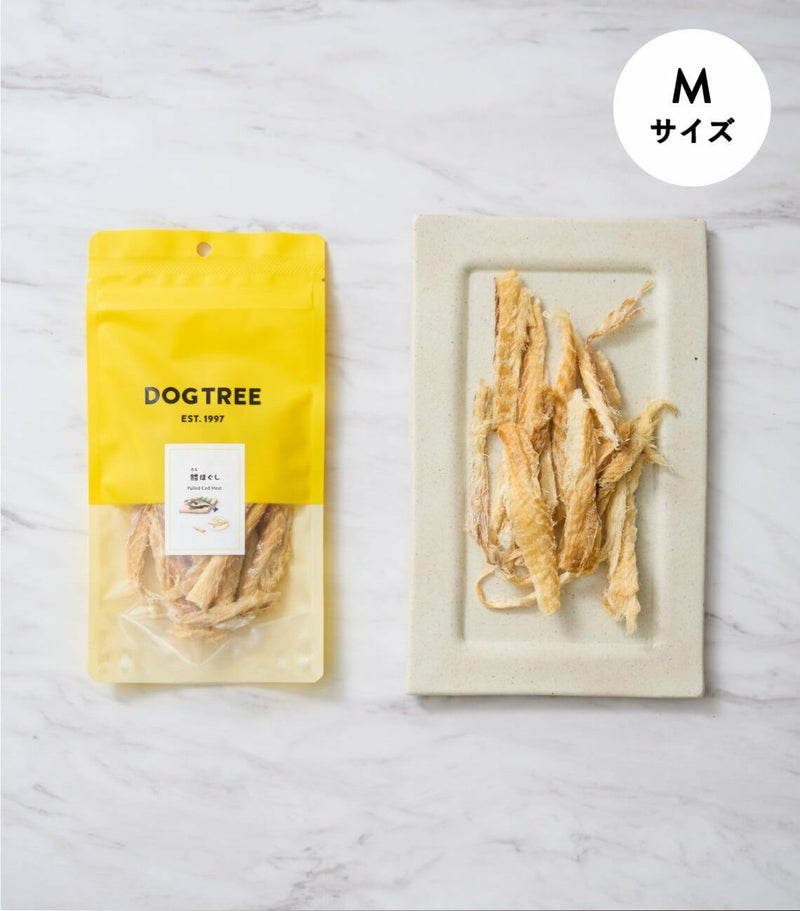 北海道近海の新鮮な鱈の身をじっくりと寒風干しにして旨味を凝縮させた、自然の旨味あふれる無添加おやつです。 鱈の身の部分だけを贅沢に使用し、ふわっと柔らかい食感にほぐしました。白身魚の鱈は、高タンパク・低カロリー、ビタミンやミネラルが豊富に含まれ、青魚や赤魚に比べ低アレルギーな健康食材です。手で簡単にほぐせるので、そのままあげても、ご飯やスープのトッピングにもお勧め。 柔らかいので幼犬から老犬まで幅広く与えられます。※骨片の除去には万全を期しておりますが、まれに付着、混入している場合がございますのでご注意ください。
