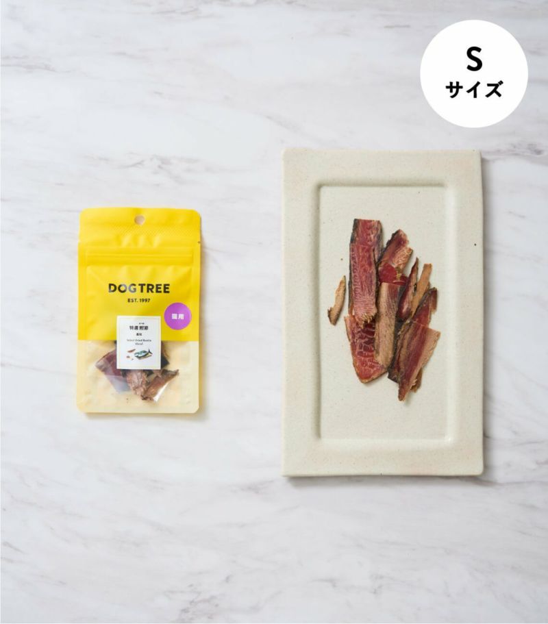 国産・産地指定のにゃん旨シリーズ。保存料・添加物・着色料を一切使用していません。 高知の漁港で獲れた新鮮な鰹の節を厚めにスライスし、柔らかいジャーキーに仕上げました。嗜好性抜群です。ご褒美・躾け用おやつとしても、フードのトッピングとしても最適です。