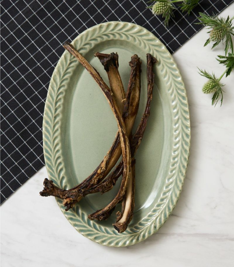 国産天然鹿のあばら骨(ジビエ)をじっくり時間をかけて独自製法で乾燥仕上げしました。 肉片が付いて風味豊かで、わんちゃんの食いつき抜群です。鹿の骨はカルシウムが豊富でアミノ酸やミネラルなどがバランスよく含まれています。 歯と歯茎の健康とストレス解消に最適です。 大型犬向けのロングサイズの骨です。