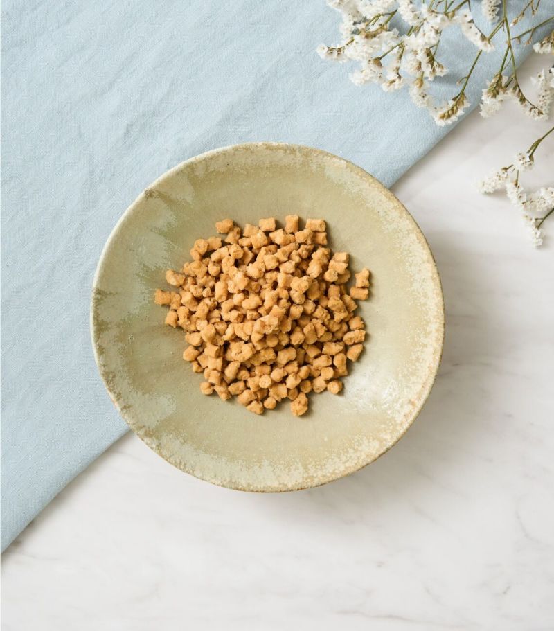 鶏ささみをそぼろ状にしてからつなぎを一切使わずに細長く形成した後、一口サイズにカットしました。 噛む力が弱いわんちゃんも食べやすい、サクサク食感のビッツです。 鶏ささみは、良質なたんぱく質が豊富で、低脂肪です。また牛や豚よりも必須アミノ酸のバランスに優れています。 またささみは繊維が細くてやわらかく、消化吸収に優れています。どんな年齢のわんちゃんにもおすすめです。 そのまま与えられるサイズなので、トレーニングやしつけのご褒美おやつに最適です。