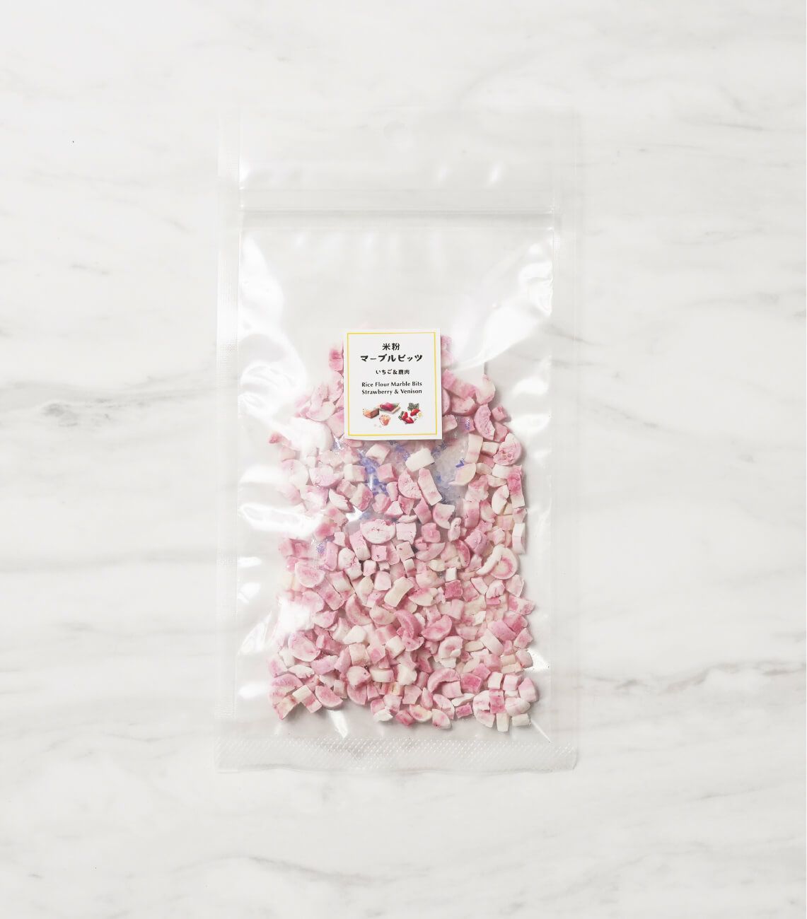 小麦粉・卵・砂糖不使用のグルテンフリー米粉ビッツ。 嗜好性の良い国産の鹿肉パウダーと苺を混ぜ込み、見た目もかわいいマーブル柄に焼き上げました。甘酸っぱい苺と優しい蜂蜜の甘さがわんちゃんを虜にします。カリカリした食感に満足度も上がります。さらに低カロリーでダイエットにぴったり。 安心安全な国産・無添加(着色料、保存料、香料不使用)おやつです。お出かけに便利な小袋入りです。