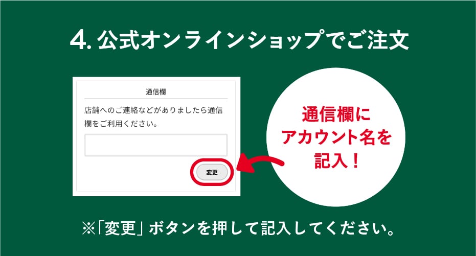 4.公式オンラインショップの商品ページで、写真送付の選択項目から「送付しました」を選択。 カートに入れ、通信欄にアカウント名を入力しご注文(アカウント名の入力がない場合はご注文をキャンセルします)