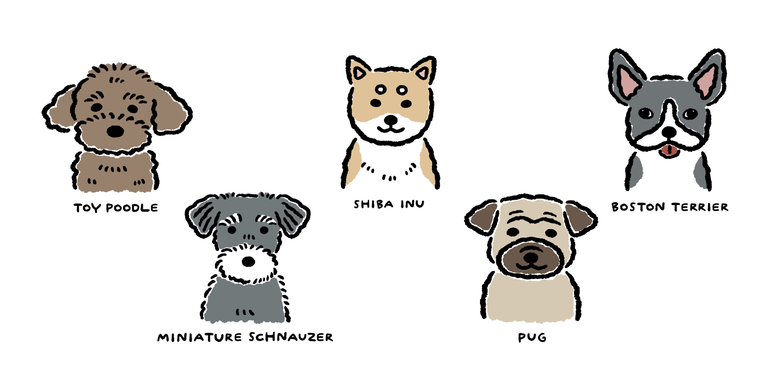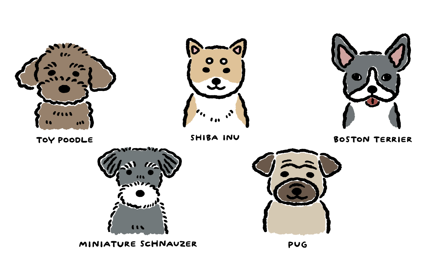 ご自身の愛犬でもある柴犬をはじめ、トイプードル・ミニチュアシュナウザー・ボストンテリア・パグを描いていただきました。